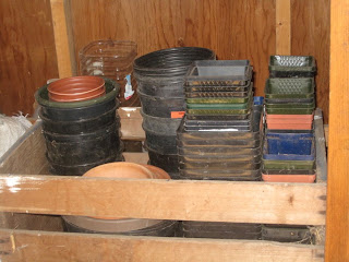 Every summer 'Clean out the shed' is on my list of chores. This time I think it took 2 years before I tackled it. The day started out gray and cold. The sun did not appear till about 2:00. That was a relief. Cleaning the shed is like working in an attic; no fun on a hot day. So now you see the plastic pots are stacked and stored;